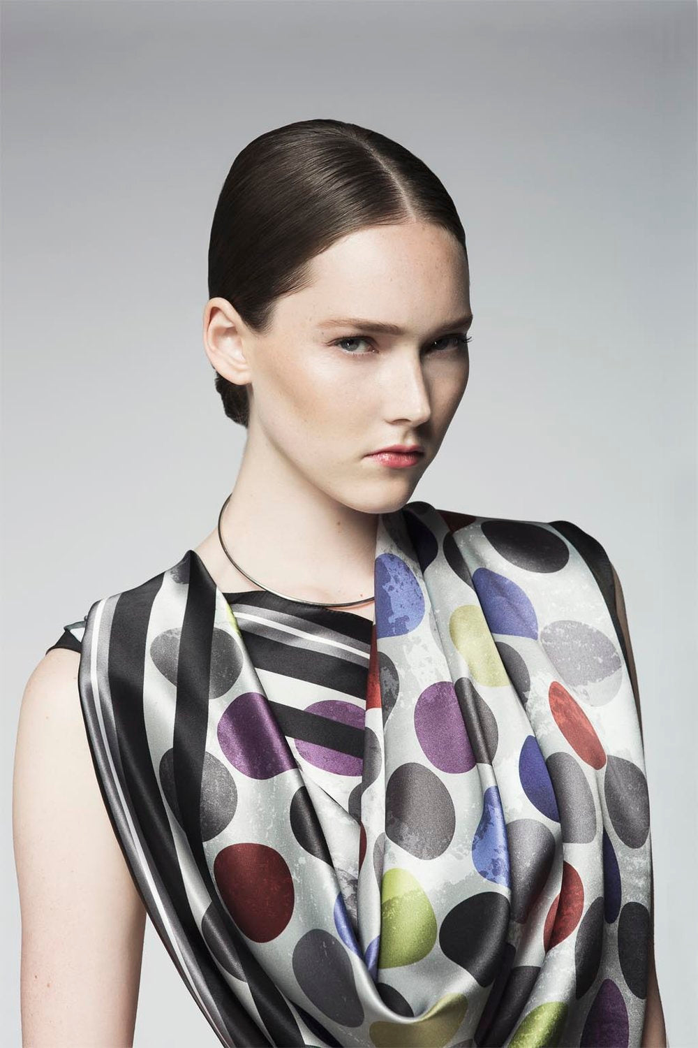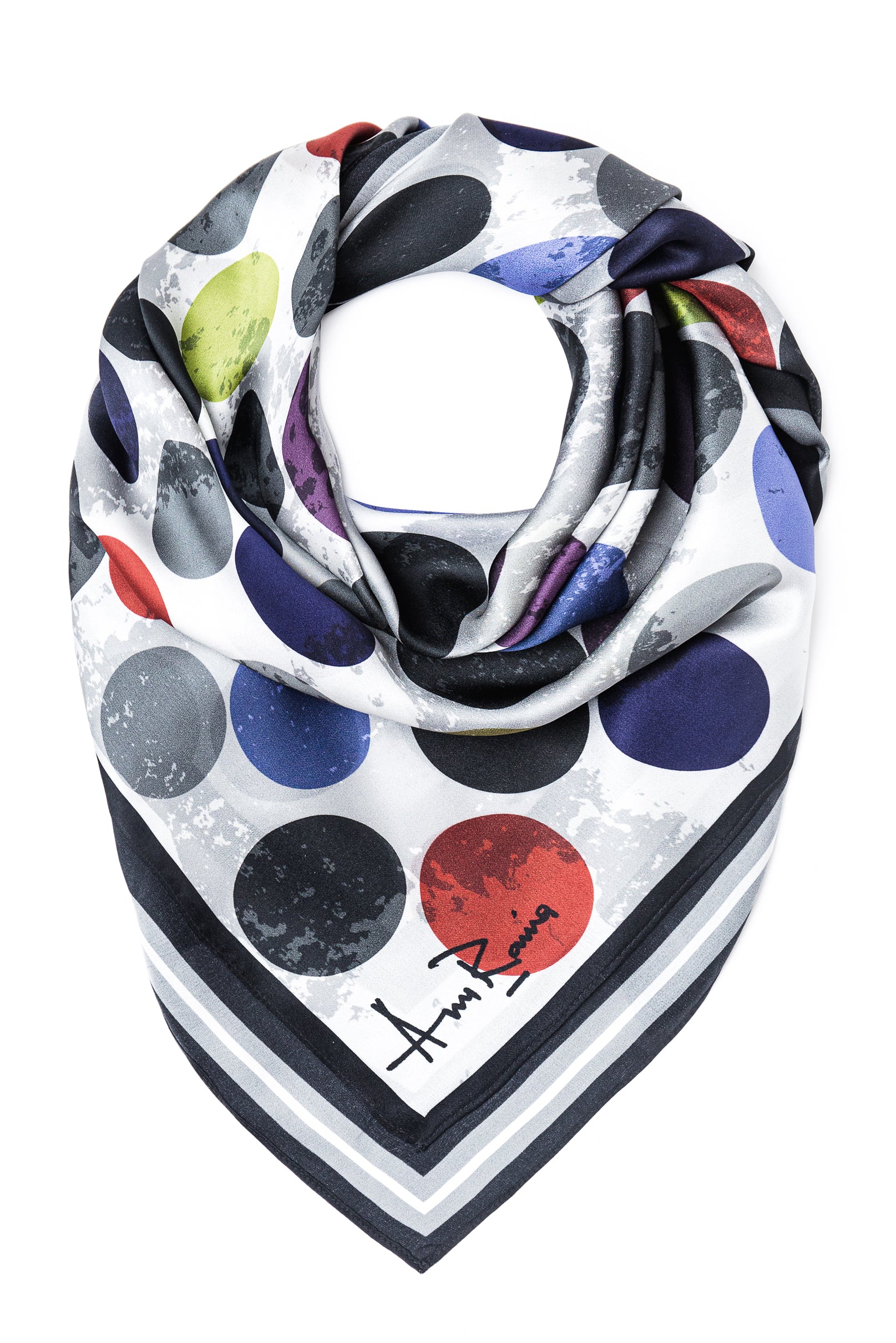 42 X42 inch Square Silk satin scarf. Original print by Anu Raina, designed and manufactured in Toronto with imported materials. Dry Clean only.