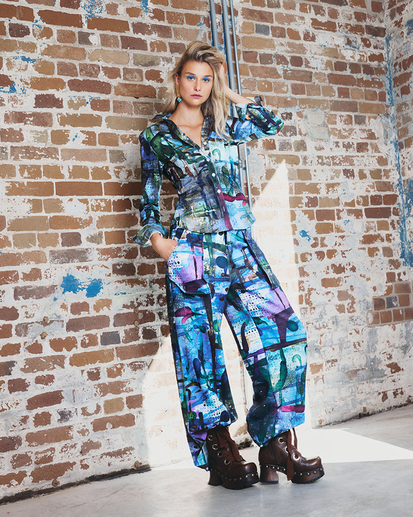 Fitted blouse in our original abstract print inspired by nostalgic childhood moments of quiet turmoil reimagined in colour and form. Designed and crafted in Canada.